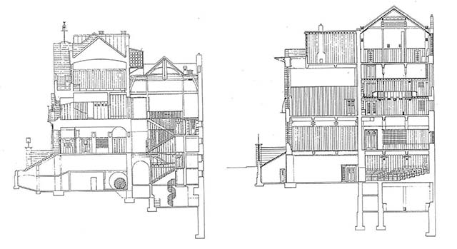 accentuation partie centrale avec verrière, éclairement cour intérieure, salle du public (2 verrières), intégration d'éléments de confort (chauffage), éléments faussement structurels apparents, statues (faites pour êtres vues d'en bas)