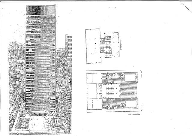 batiment mis en valeur, création place publique, vitrage spécifique, lumière particulière quand bureaux allumés la nuit, couleur bronze posé sur plaque granit, éléments structurels visibles (rajout poteaux en façade), batiment le + cher au monde (matériaux + déco int.)